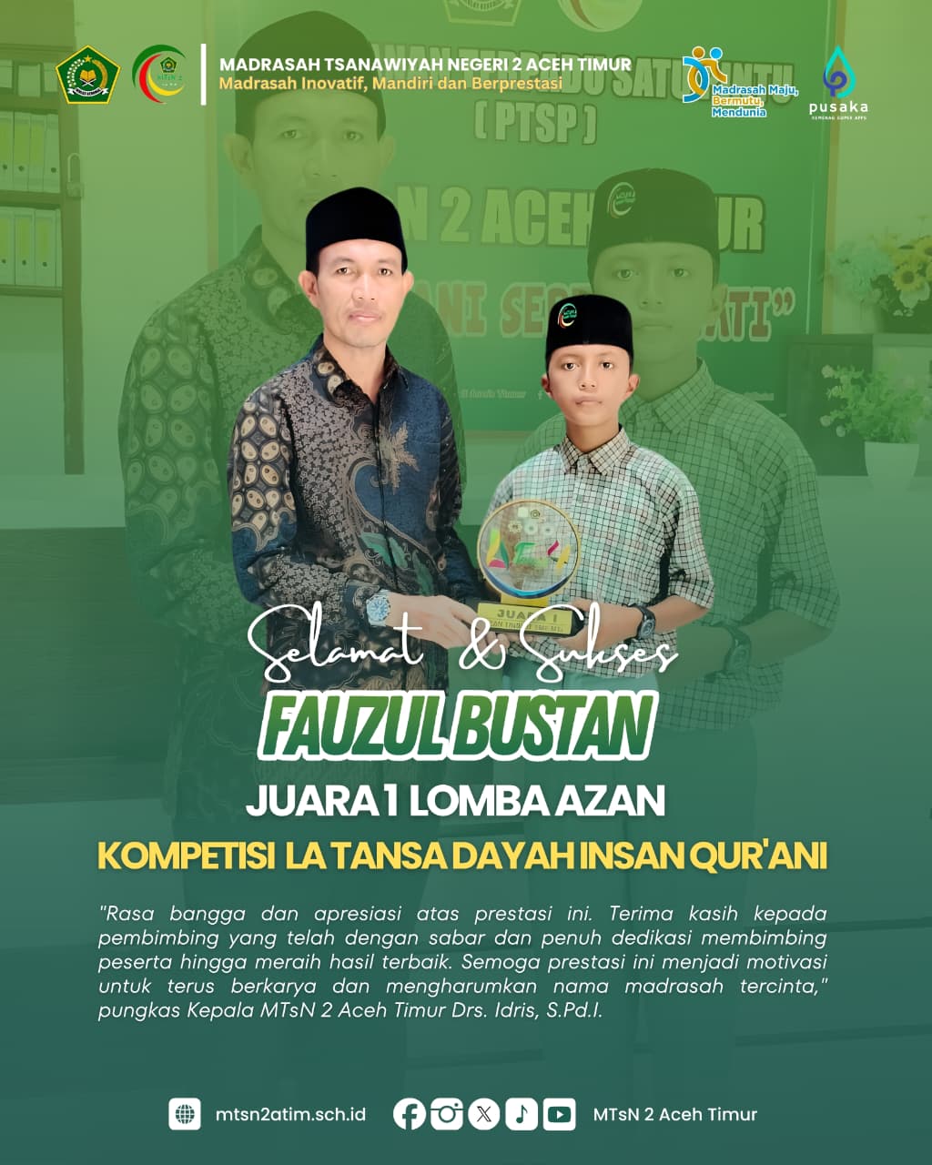 “Alhamdulillah, selamat kepada Fauzul atas keberhasilannya meraih Juara 1 Lomba Azan. Kami juga mengucapkan terima kasih kepada guru pembimbing yang telah dengan sabar membina dan mendampingi peserta didik selama proses persiapan. Semoga prestasi ini menjadi inspirasi bagi peserta didik lainnya untuk terus berusaha, berlatih, dan berprestasi di bidang yang mereka minati,” ujar beliau.
