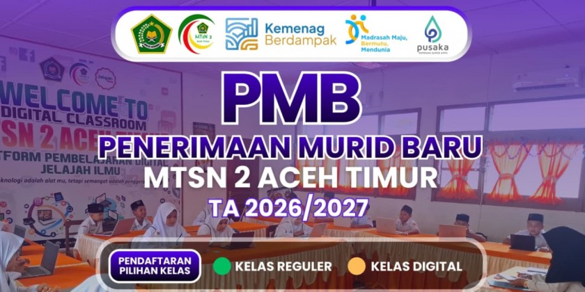 Aceh Timur [09/02/2026] — Penerimaan Murid Baru (PMB) MTsN 2 Aceh Timur tahun pelajaran 2026/2027 resmi dibuka. Maka dengan ini kami informasikan kepada seluruh masyarakat dan orang tua murid agar segera mendaftarkan putra/putrinya pada MTsN 2 Aceh Timur Kecamatan Idi Rayeuk Kabupaten Aceh Timur dengan ketentuan sebagai berikut: